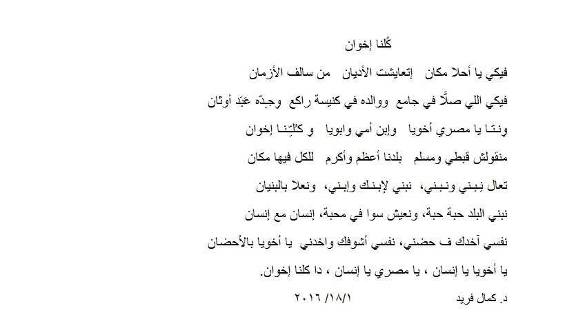 ونتا يا مصري أخويا، وإبن أمي وبويا، وكلنا إخوان.